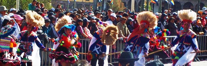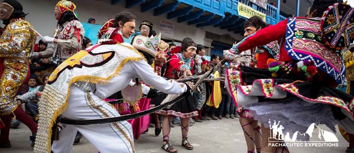 In Paucartambo, at 110 km from Cusco, we celebrate Del Carmen Virgin or Mamacha Carmen festivity. She is the mother of mestizos, that is to say those children born from Spaniards and native mothers. During the celebration, we can appreciate a colorful parade filled with music, choirs that sing in Quechua and groups that represent different Peruvian history dramatizations. On the main day, the image of the Virgin goes on procession by the town streets blessing the participants and scare away the demons that practice risky pirouettes over the roofs. The war between the faithful and the demons is a show that mixes paganism and faith. The endless fight between the good over the evil where good ones win. Come and celebrate the Mamacha Festivity!
