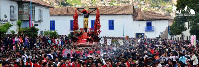 (Lord of earthquakes) Cusco. Ever since 1650, when the faithful claim that an oil painting of Christ on the Cross held off a devasting earthquake that was rattling the city of Cusco, the locals have been honoring the image of Taytacha Temblores, the Lord of the Earthquakes. The image used today was donated by King Charles V and despite centuries of smoke from candles and incense, no one has dared to restore the blackened painting, that given the Christ a somber aspect and a dark countenance. The Lord of the Earthquakes is taken out in procession through the streets of the city just as the Incas used to parade the mummies of their high priests and high rulers. This celebration is of particular interest because it allows onlookers to get a glimpse of the fusion of Andean religions and Christianity.
