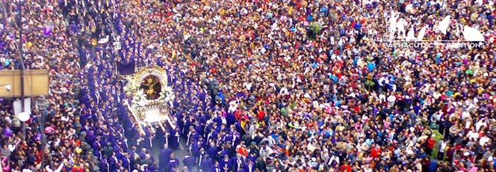 (Lord of The miracles Parade): (Lima):multitudinary processions worldwide takes the procession dates back to colonial times, when a slave drew the image of a black Christ on the walls of a wretched hut in the plantation of Pachacamilla, near Lima. The famous image has remained intact in spite of time, earthquakes and other cataclysms. As a result worship of the image rose to new heights, until it became the largest procession in South America. During the whole month the litter is taken in a trailer to distant places throughout the city followed by ten of thousands pilgrims dress in purple tunics. Around this time of year, the streets fill with vendors of a wide variety of typical dishes sweets, such as the famous Turron de Doña Pepa. In October to commemorate the Lord of Miracles (Señor de los Milagros) Lima hosts the well-known bullfight season in which the best toreros in the world participate. It takes place in the centuries-old Plaza de Acho bullring.